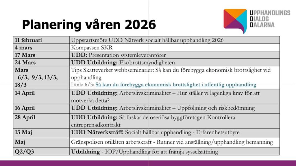 Vårt nätverk Socialt hållbar upphandling Dalarna är en regional plattform för erfarenhetsutbyte och kompetenshöjning inom socialt hållbar upphandling. Under 2025 och 2026 har nätverket ett särskilt fokus på välfärdsbrottslighet som ett hot mot demokratin, arbetslivskriminalitet och hur upphandling kan användas för att främja sysselsättning. Detta med målet att stärka nätverket och deltagarnas förmåga att agera strategiskt och rättssäkert. Arbetet omfattar bland annat kunskap om systemstöd, rutiner för kontroll, uteslutning och hävning av avtal samt erfarenhetsutbyte och tips kring oseriösa aktörer.